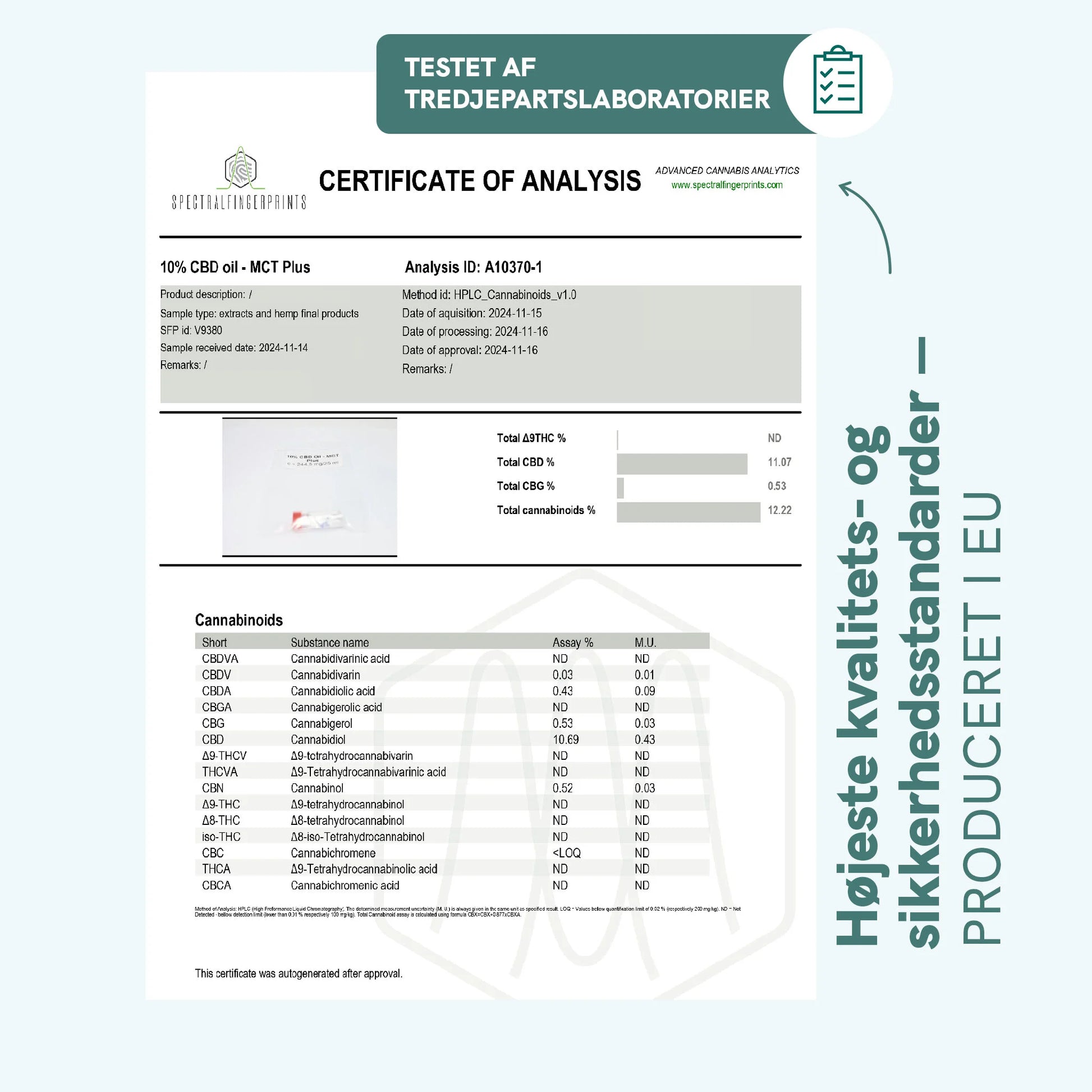 "Fuldspektret" CBD-olie betyder, at den indeholder et komplet udvalg af naturligt forekommende forbindelser, der findes i hampeplanten, herunder ikke kun CBD, men også andre vigtige sekundære cannabinoider som CBN (cannabinol), CBG (cannabigerol) og CBDa (cannabidiolsyre). Disse cannabinoider, sammen med spormængder af THC (under 0,2 %), terpener, flavonoider og andre planteforbindelser, bevares i deres naturlige proportioner og arbejder synergistisk i det, der er kendt som "entourage-effekten".
