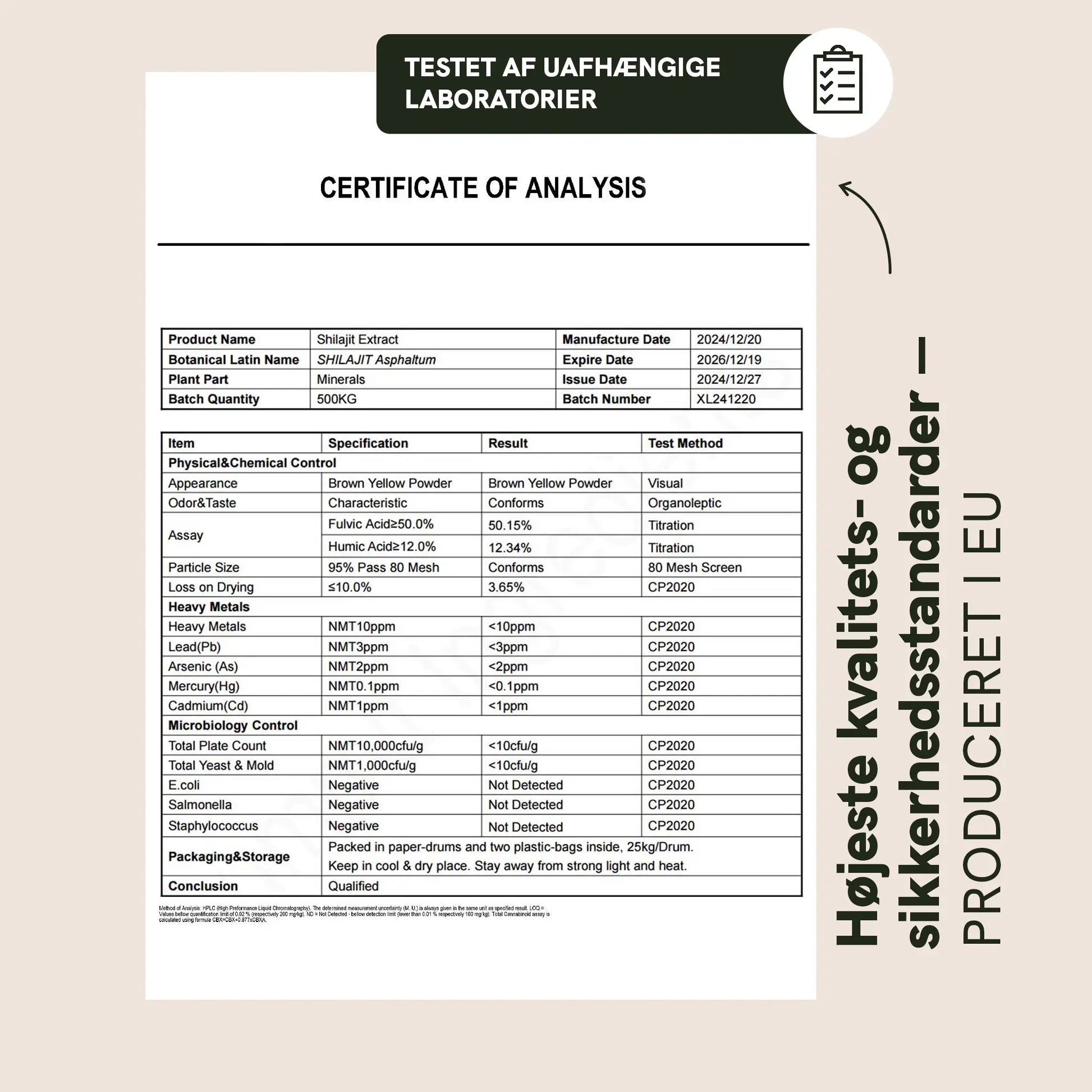 - Ekstrakt i forholdet 50:1 (svarer til 25.000 mg Shilajit-harpiks i én kapsel)