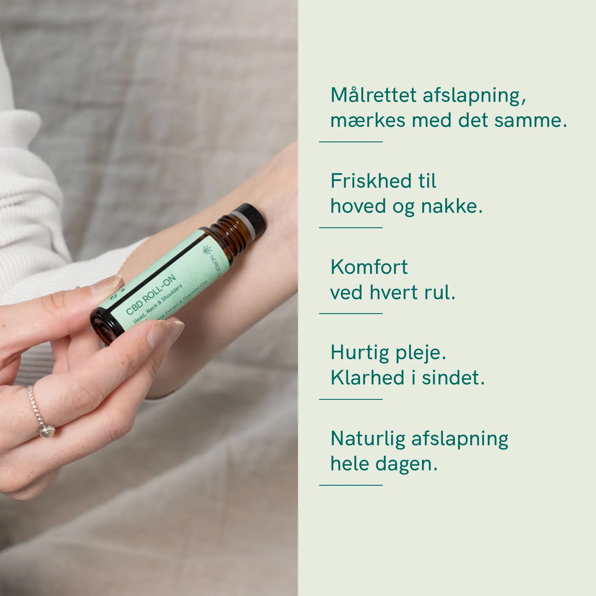 Rul din CBD Roll-On over huden på det berørte område, f.eks. hoved, tindinger, nakke eller skuldre og massér, indtil den er helt absorberet. Ryst godt før brug.
