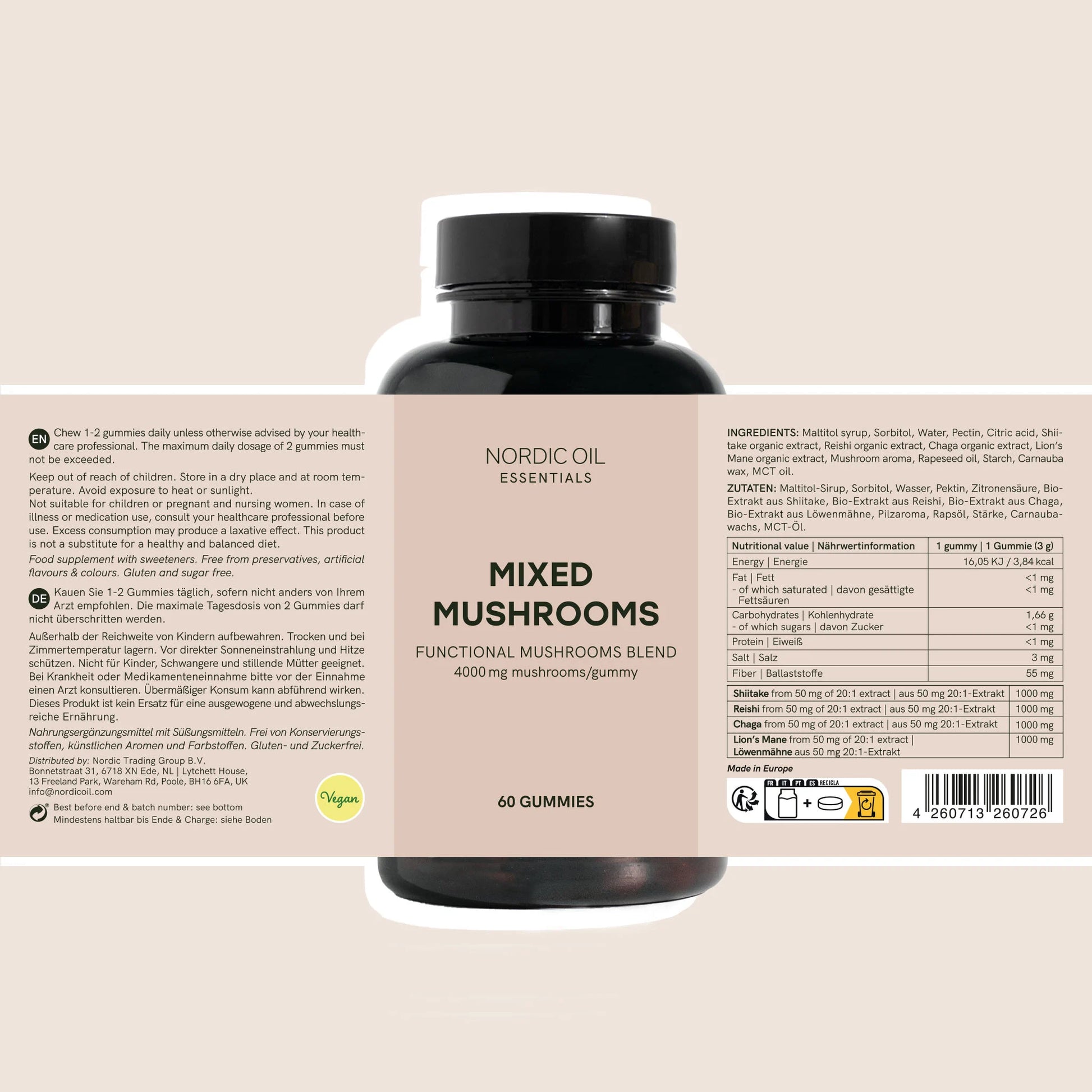 Maltitol sirup, Sorbitol, Vand, Pektin, Citronsyre, Shiitake økologisk ekstrakt, Reishi økologisk ekstrakt, Chaga økologisk ekstrakt, Lion’s Mane økologisk ekstrakt, Svampearoma, Rapsolie, Stivelse, Carnaubavoks, MCT olie.