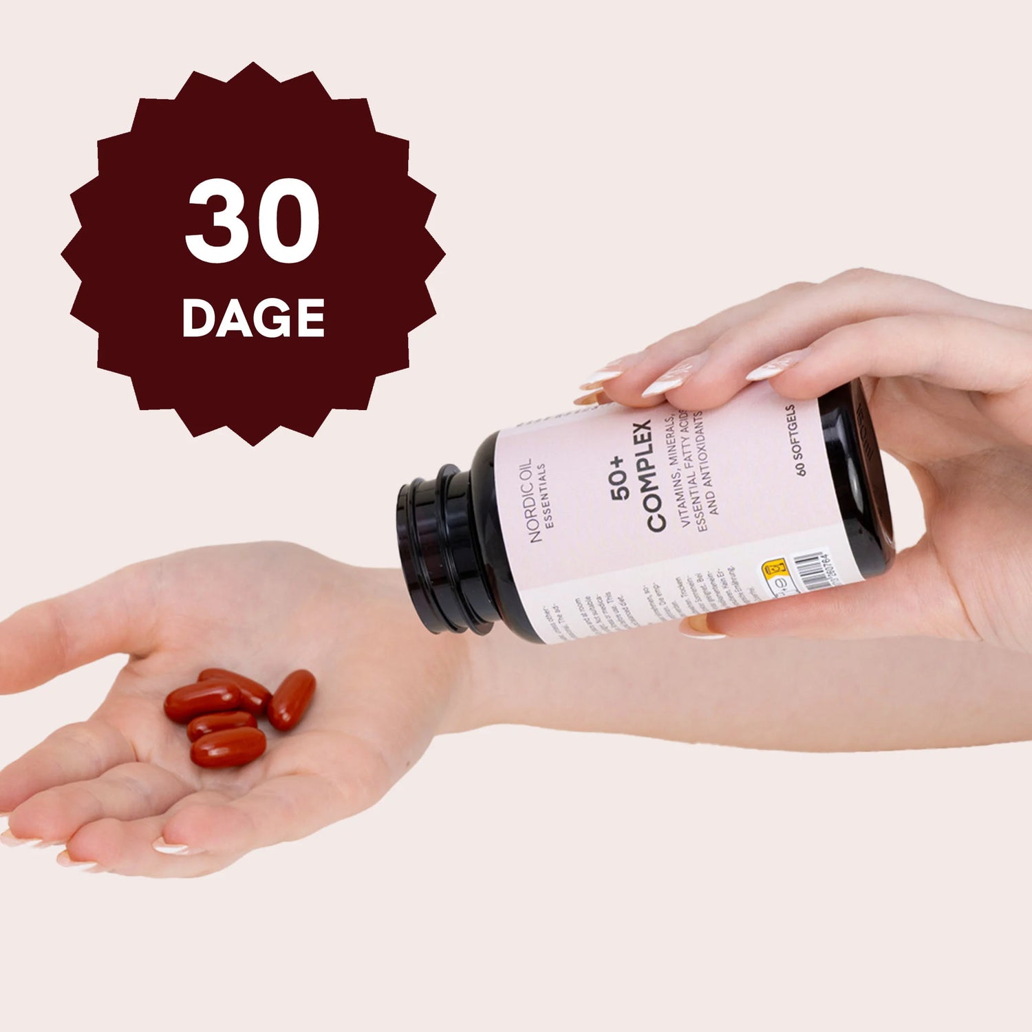 Multi Complex 50+ er din daglige ledsager til et aktivt og sundt liv efter 50. Hver kapsel kombinerer essentielle vitaminer, mineraler og Omega-3 fedtsyrer for at hjælpe dig med at holde dig på toppen. Med 300 mg fiskeolie, heraf 240 mg DHA og EPA, understøtter det en normal hjerte- og hjernefunktion.