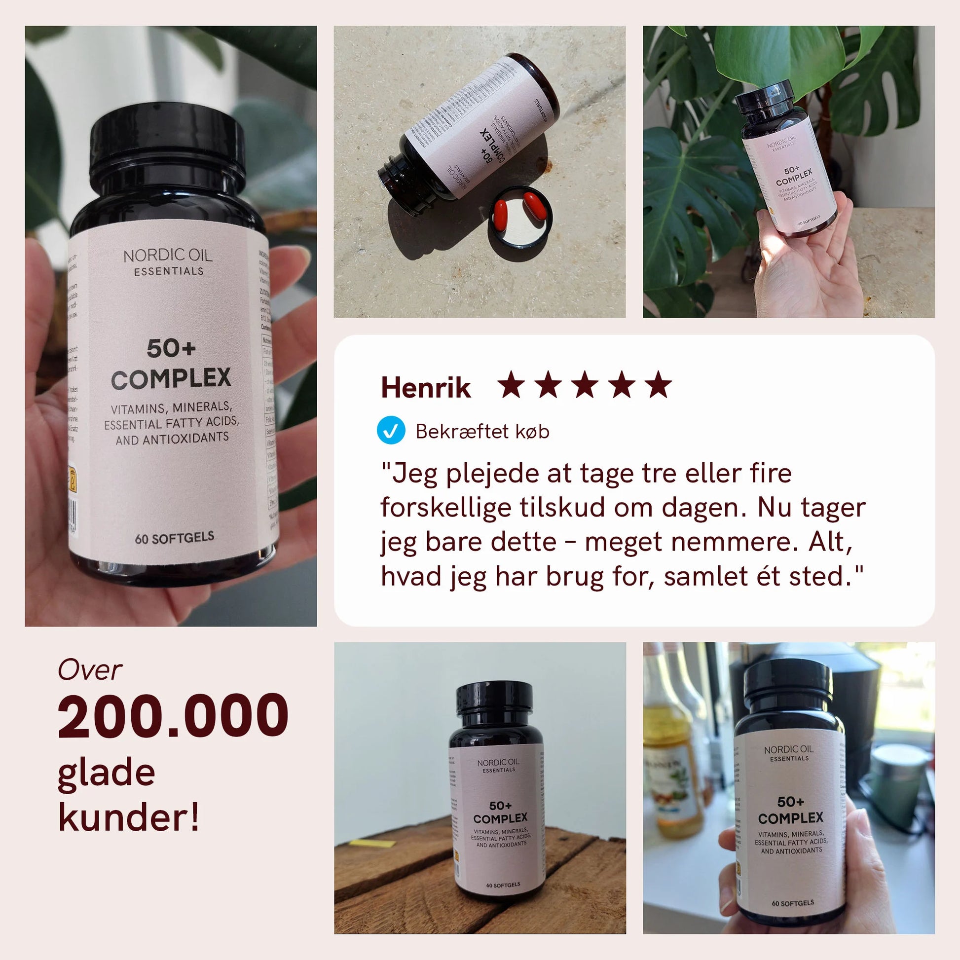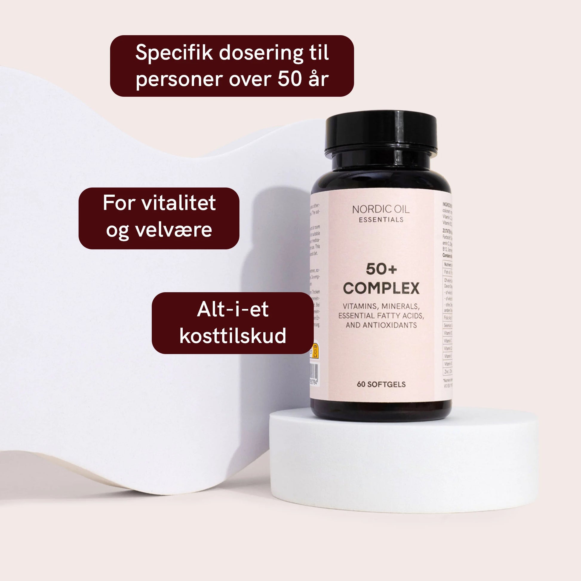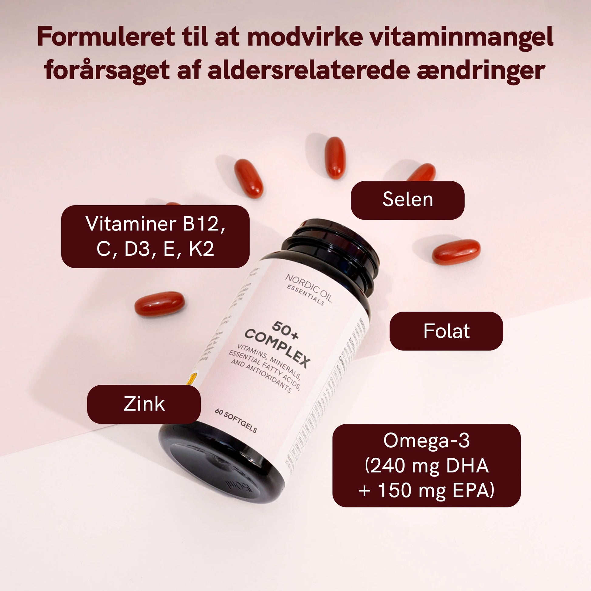 Multi Complex 50+ går videre end en typisk multivitamin. Den indeholder ikke kun et bredt spektrum af vitaminer og mineraler, men også omega-3 (DHA og EPA), som sjældent findes i standardformler. Desuden er den skræddersyet til behovene hos voksne over 50 år, hvilket gør den mere alderssvarende end almindelige multivitaminer.