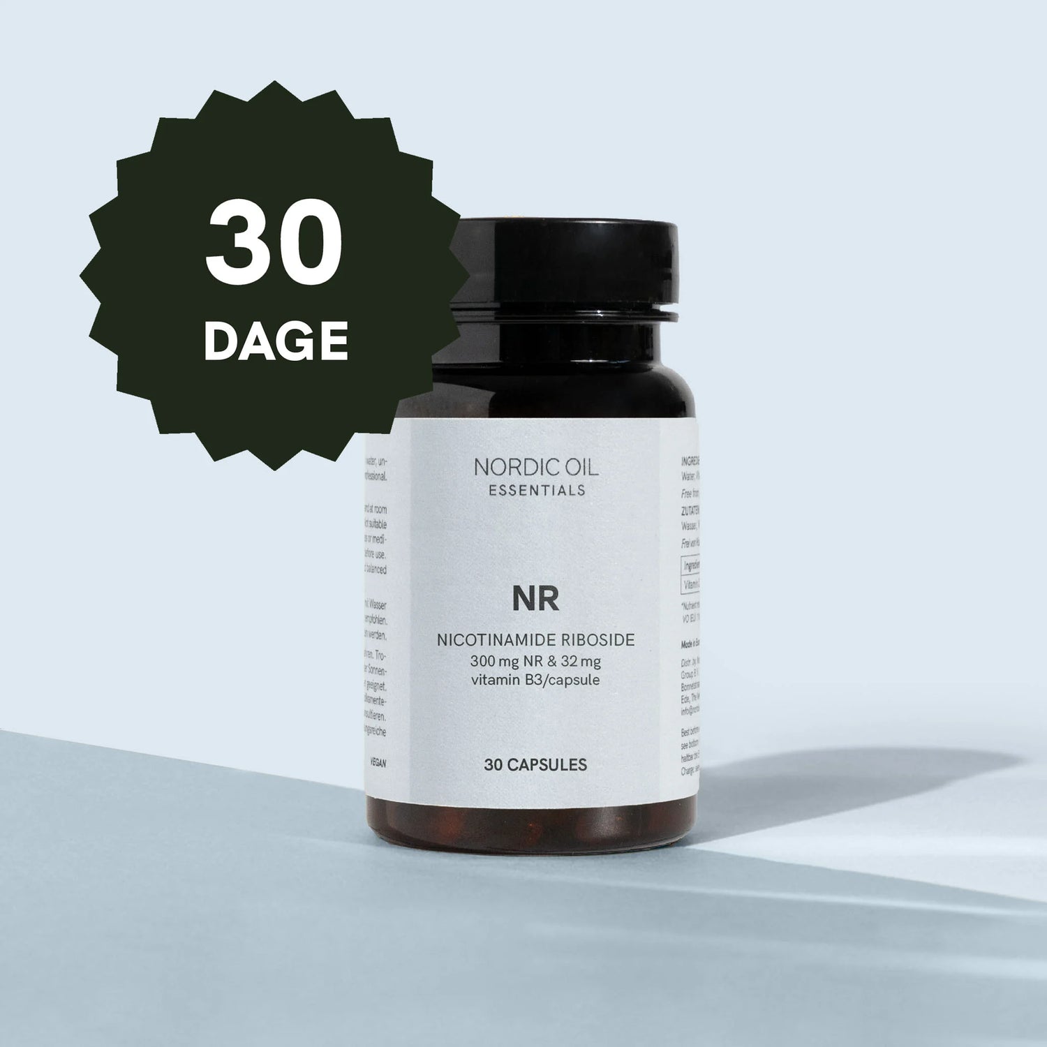 Nikotinamid-ribosid (NR) kapslerne er veganske, sukkerfri, glutenfri, fremstillet i EU og uafhængigt laboratorietestet. Hver bøtte indeholder 30 kapsler – en hel måneds forbrug til din rutine for sund aldring.