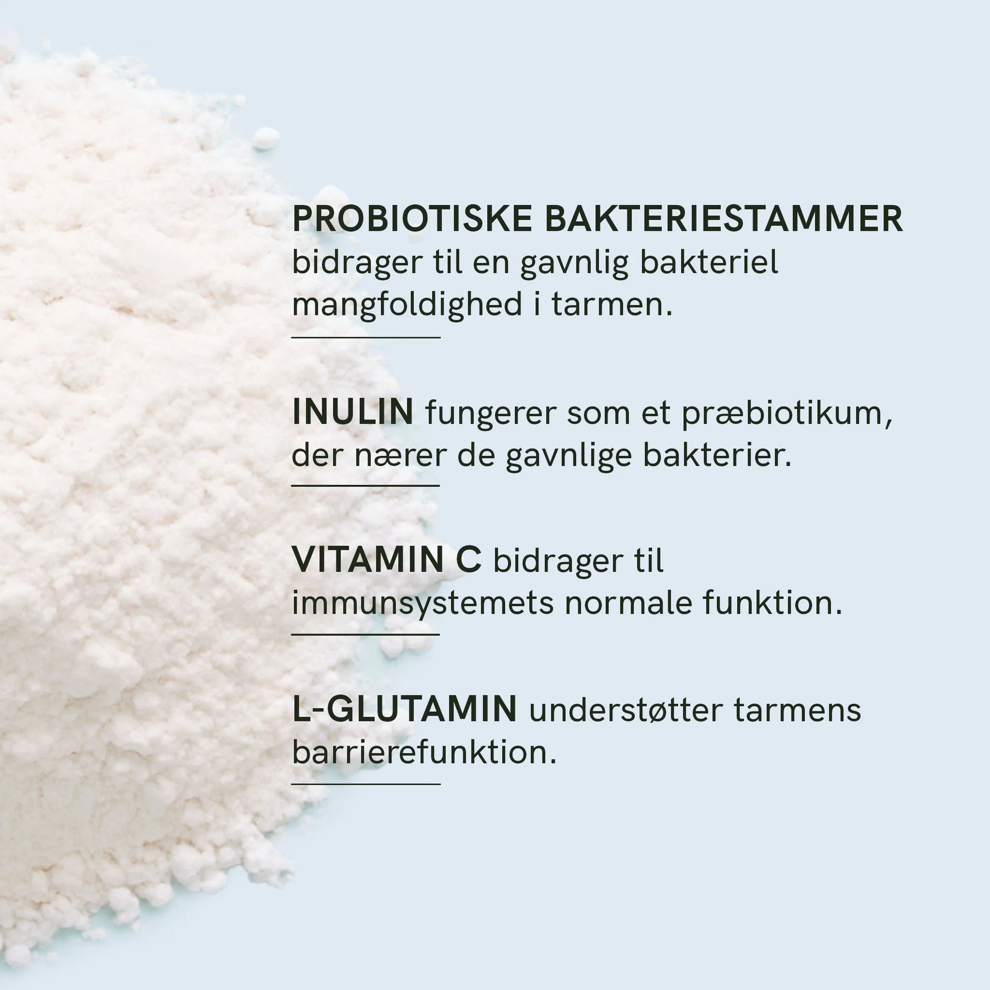 - 10 gavnlige bakteriestammer + vitamin C til immunforsvar
