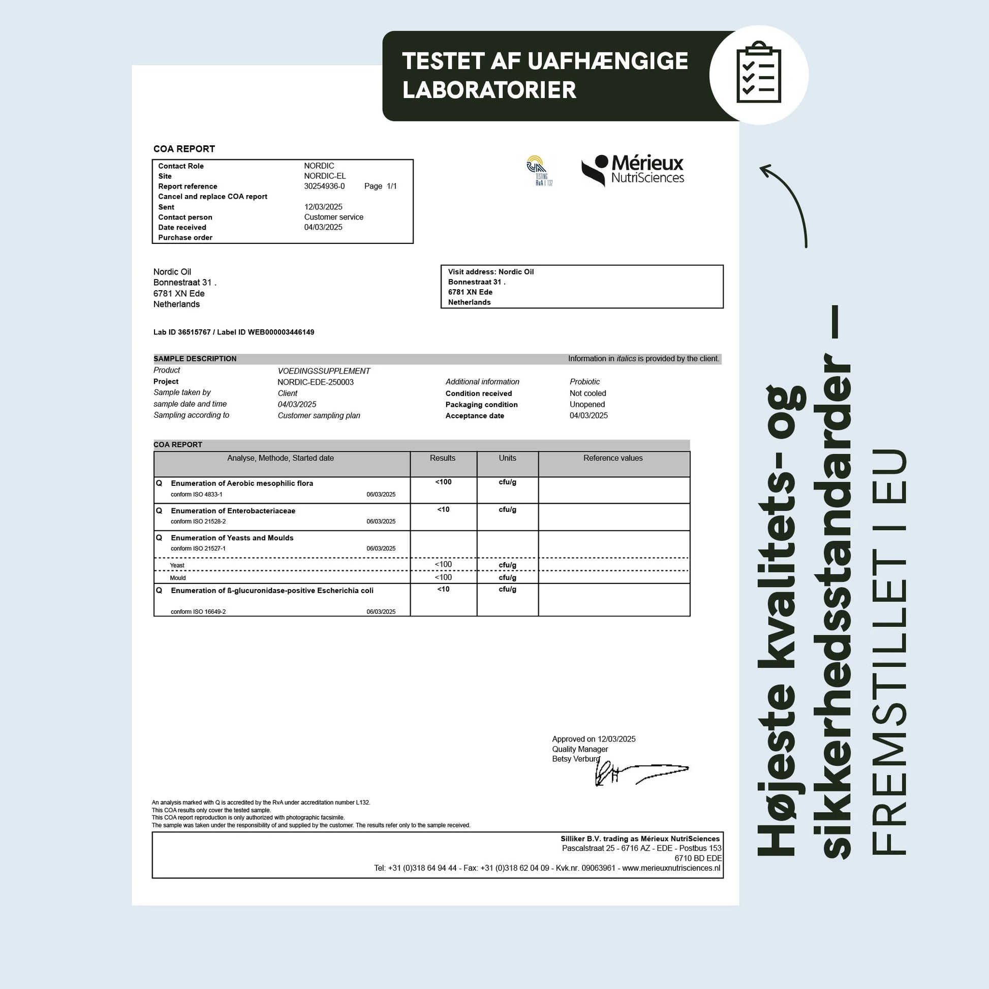 Nordic Oil Essentials Probiotics er et premium kosttilskud til tarmfloraen, designet til at fremme optimal tarmsundhed. Hver flaske indeholder 60 kapsler, hvilket giver en to-måneders forsyning. Med 25 milliarder CFU pr. kapsel og 10 forskellige stammer af gavnlige bakterier sikrer denne formel et robust bakterielt spektrum for en afbalanceret fordøjelse. Beriget med vitamin C, L-Glutamin og Inulin tilbyder disse probiotika ekstra immunstøtte, vedligeholdelse af tarmbarrieren og præbiotisk næring. Dette produkt er fri for kunstige smagsstoffer og farver og indeholder ikke CBD.
