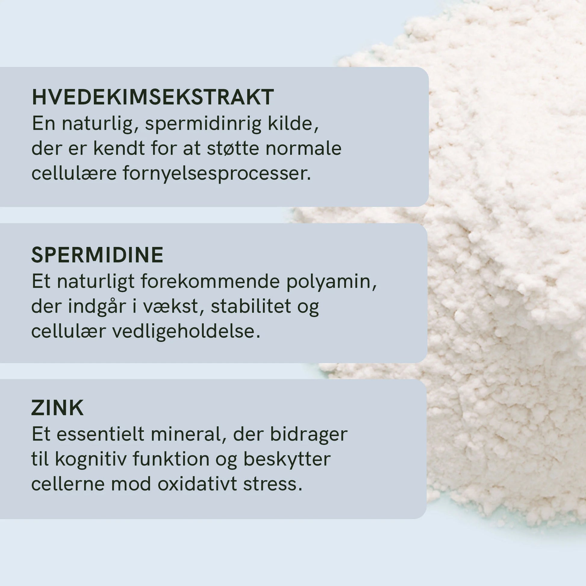 - Op til 6 mg spermidin + 4,5 mg zink pr. daglig dosis