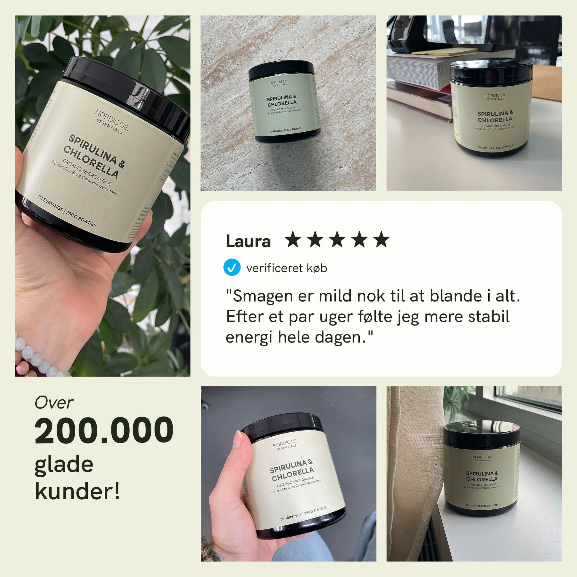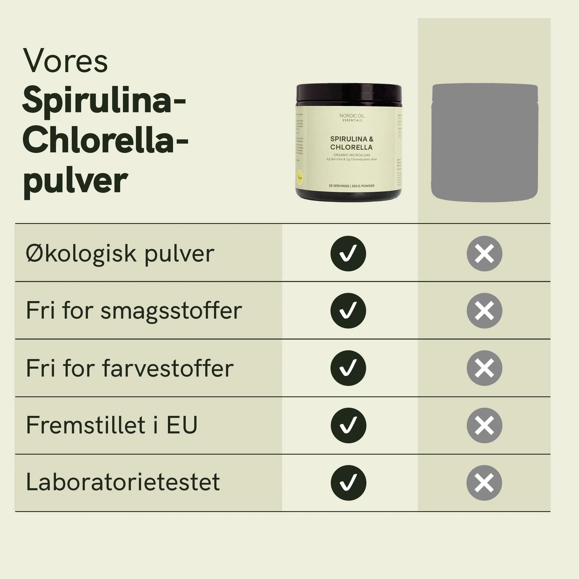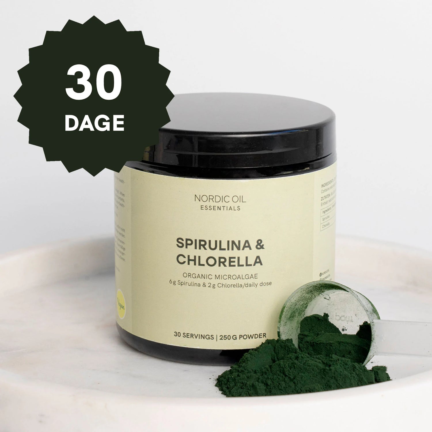 Nordic Oils økologiske spirulina- og chlorella-pulver samler to af naturens mest næringsrige mikroalger. Hver daglig skefuld på 8 g indeholder 6 g spirulina-pulver og 2 g chlorella-pulver. Det er en afbalanceret blanding til dig, der vil have chlorella- og spirulina-pulver i ét enkelt produkt. Én skefuld om dagen gør det nemt at få glæde af spirulina og chlorellas naturlige egenskaber.