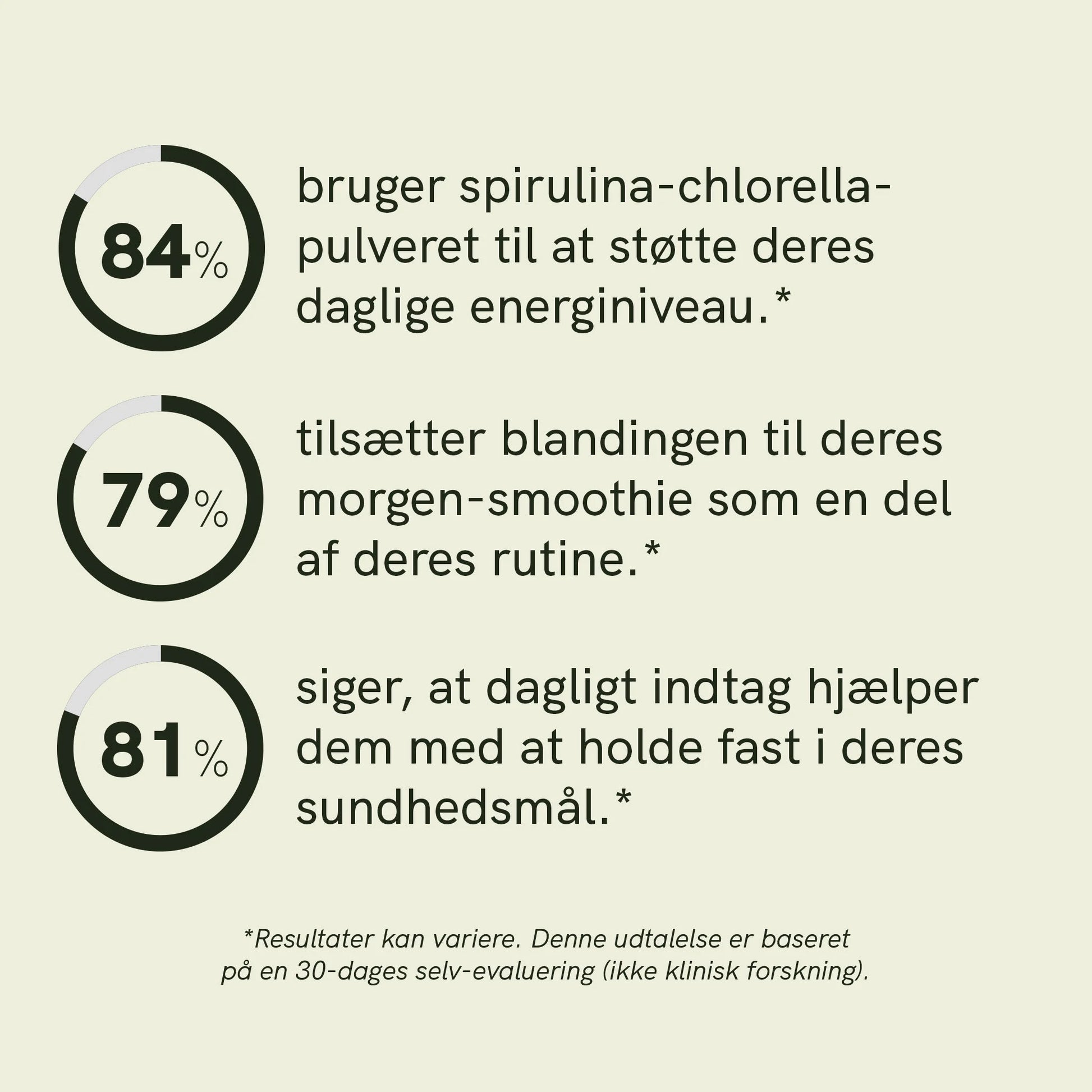 - 8 g daglig dosis: 6 g spirulina og 2 g chlorella-pulver