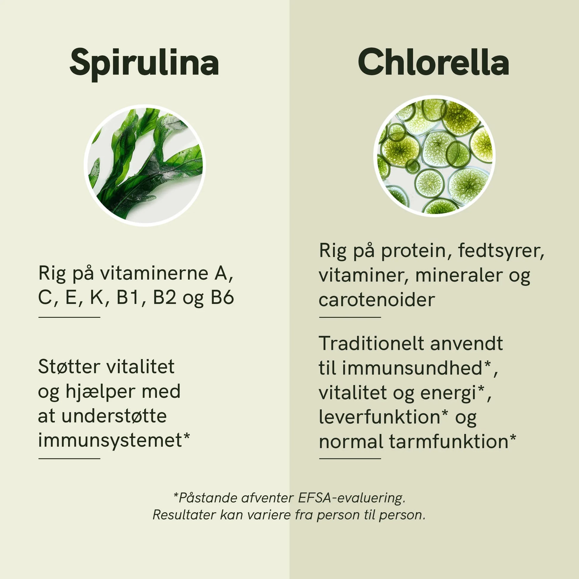 De to alger supplerer hinanden naturligt: Spirulina er rig på protein, phycocyanin, B-vitaminer og mineraler. Chlorella giver højt klorofylindhold, essentielle mikronæringsstoffer og yderligere phytonutrients. Sammen skaber de en afbalanceret, næringstæt blanding, der minder om mangfoldigheden i grønne fuldkostkilder.